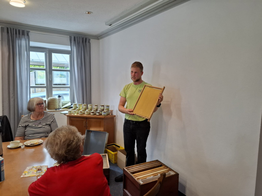 Diese herausragende Leistung macht die Biene zu einem der wichtigsten Nutztiere der Welt. Der von der Imkerei Muhr hergestellte Honig stammt ausschliesslich aus Deutschland. Von der hervorragenden Qualität des Honigs durften wir uns schließlich auch noch überzeugen, denn Julian hatte eine Vielzahl an unterschiedlichen Sorten für uns zum Probieren dabei. Und zu guter Letzt überließ er uns die "Probiergläser" als Geschenk und wir werden den Honig in unseren nächsten Treffen sicher mit Genuß als Aufstrich verzehren. Ein herzliches Vergelt´s Gott geht an dieser Stelle an Josef Muhr, den Betreiber der Bioland-Imkerei und Julian, seinen Mitarbeiter, für den wunderbaren Einblick in die komplexe Welt der Bienen. Unsere Senioren waren ausnahmslos von dem Vortrag begeistert und alle waren sich einig, dass die nächste Honigsemmel mit einem anderen Bewußtsein gegessen wird.